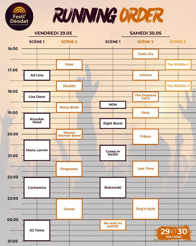 Cliquez sur le running order ci-dessous pour découvrir les horaires et chaque artiste programmé.